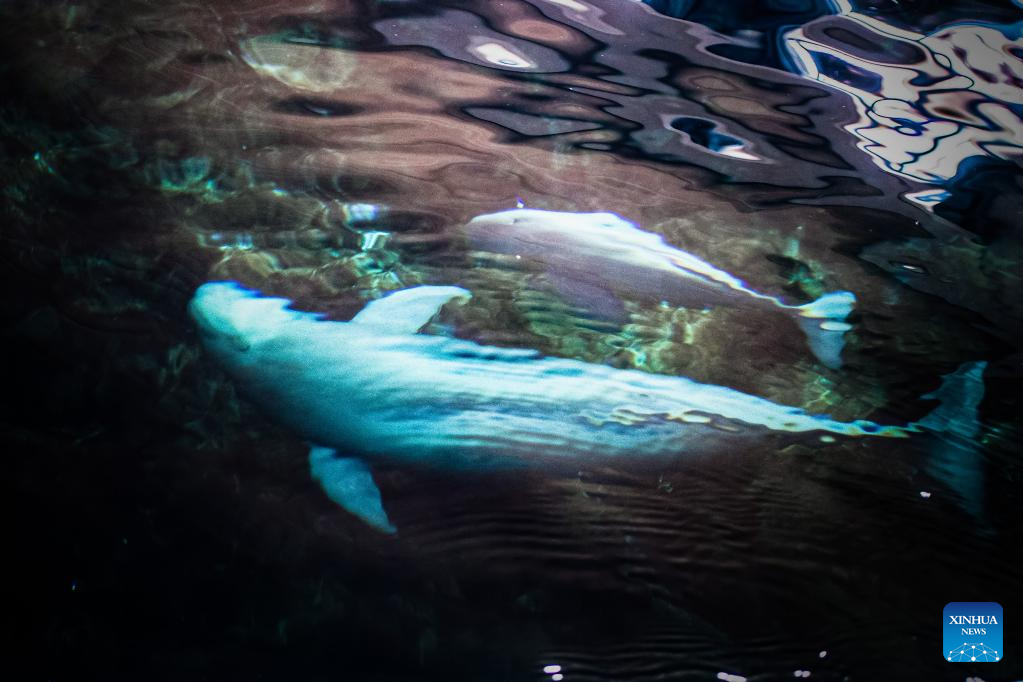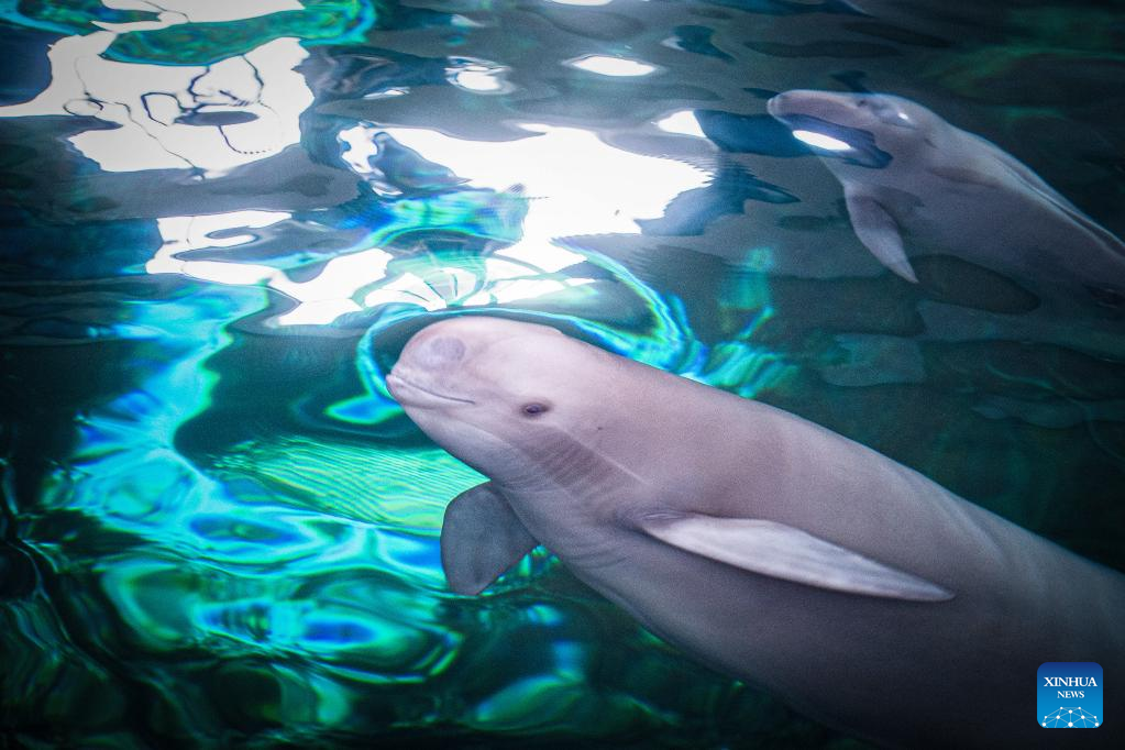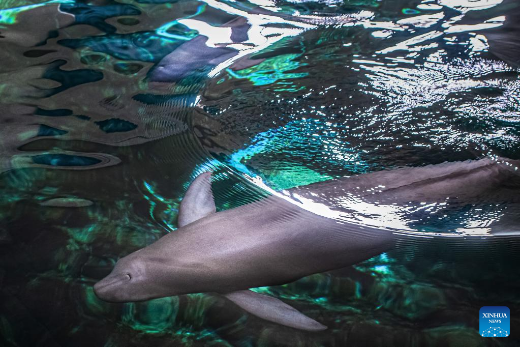 In addition to the newly born F9C22, there are six other Yangtze finless porpoises in captivity, three of which were bred through artificial breeding. (Xinhua/Xiao Yijiu)