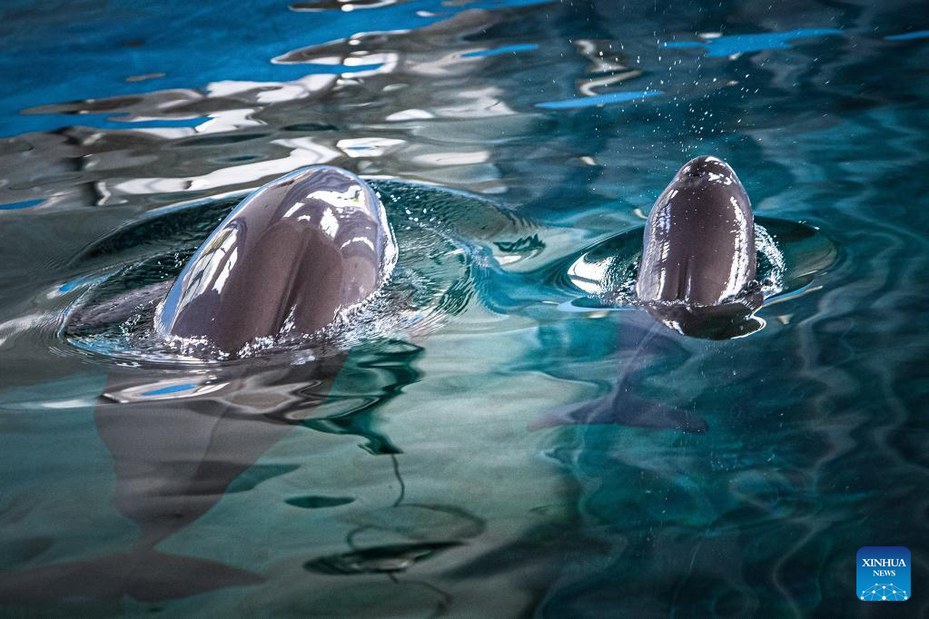 Yangtze finless porpoise F9C22 swims with its mother in the water at the Institute of Hydrobiology (IHB) of Chinese Academy of Sciences in Wuhan, central China's Hubei Province, June 29, 2022. Yangtze finless porpoise Fujiu gave birth to a baby Yangtze finless porpoise numbered "F9C22" at around 21:35 on June 27, marking an achievement in artificial breeding and reproduction of the species.