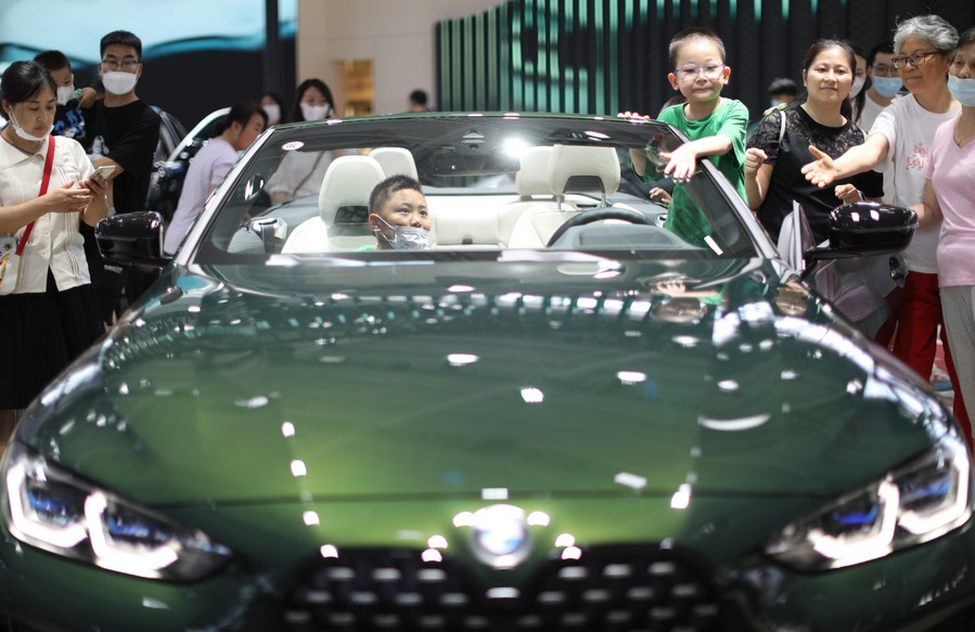 Visitors view a vehicle model during the Shenyang (China) International Automobile Industry Expo 2022 in Shenyang, northeast China's Liaoning Province, June 26, 2022. (Xinhua/Yao Jianfeng)