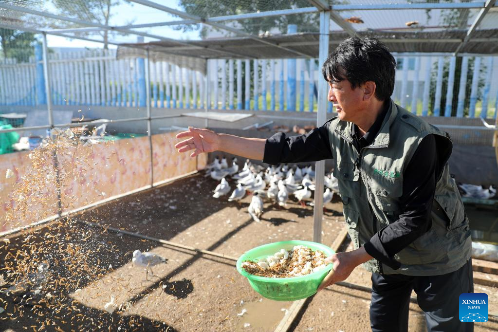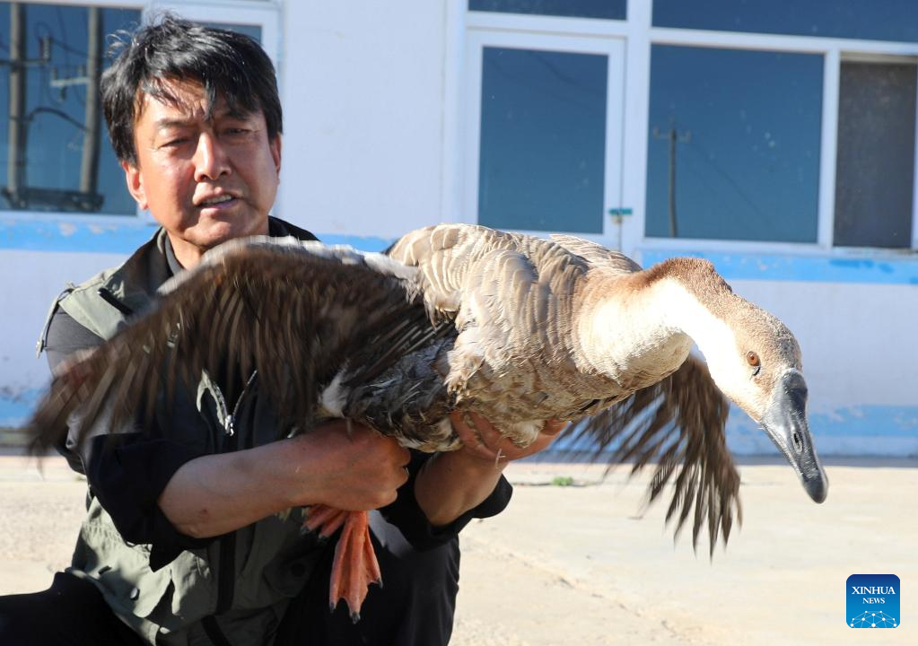 Ma Xirong checks on a swan goose at a wildlife rescue station in Kangbao County of Zhangjiakou City, north China's Hebei Province, July 6, 2022.