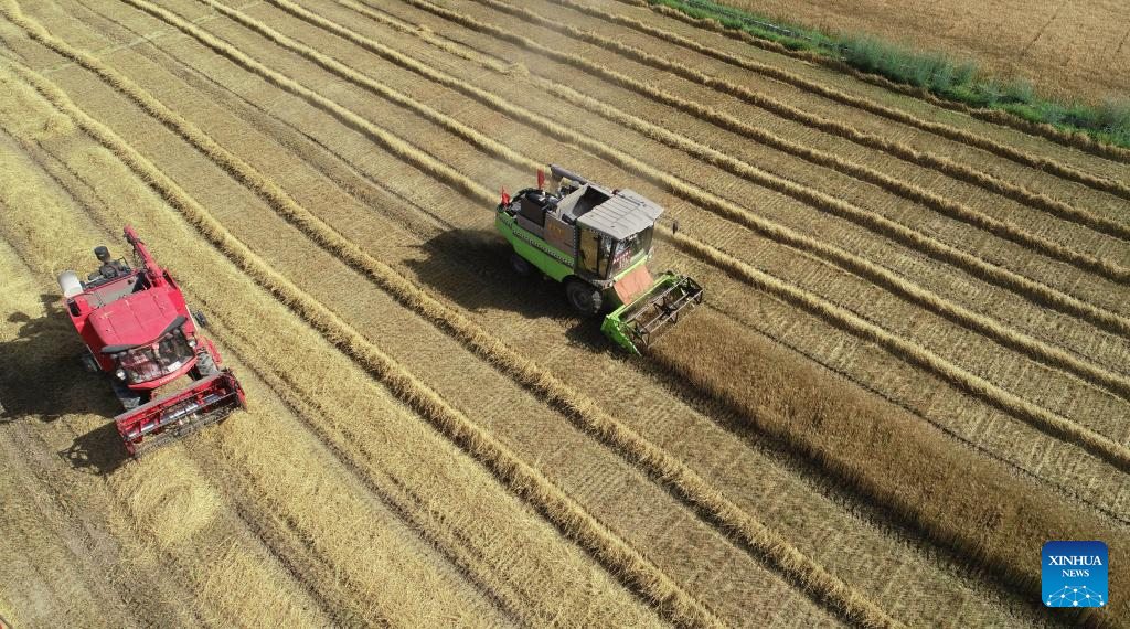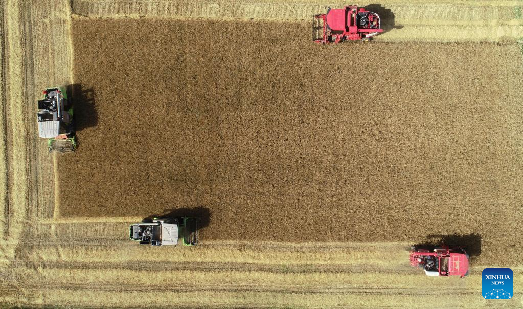 Aerial photo taken on July 7, 2022 shows combine harvesters working at wheat fields in Xiaodianzi Village of Pingluo County, northwest China's Ningxia Hui Autonomous Region. As wheat harvest season comes, local agricultural sector in Pingluo County conducted series of trainings for villagers to ensure harvest with high quality and efficiency. (Xinhua/Wang Peng)