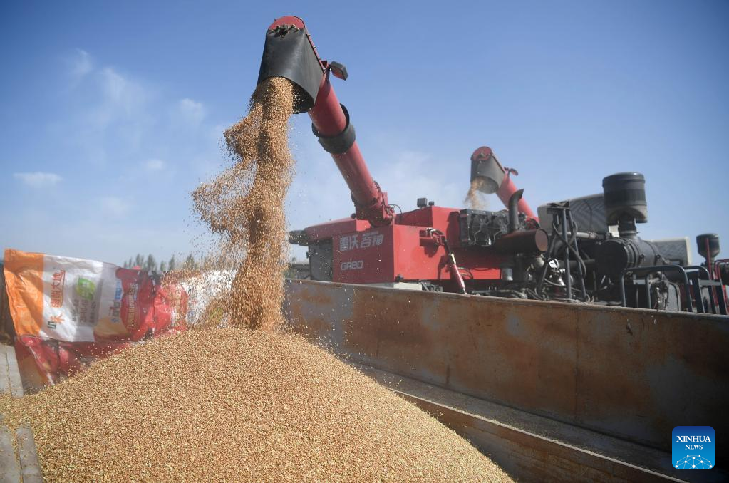 A combine harvester loads wheat at Xiaodianzi Village in Pingluo County, northwest China's Ningxia Hui Autonomous Region, July 7, 2022. As wheat harvest season comes, local agricultural sector in Pingluo County conducted series of trainings for villagers to ensure harvest with high quality and efficiency. (Xinhua/Wang Peng)
