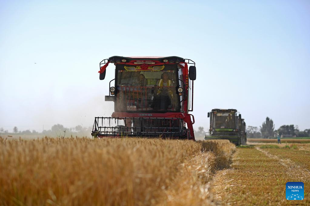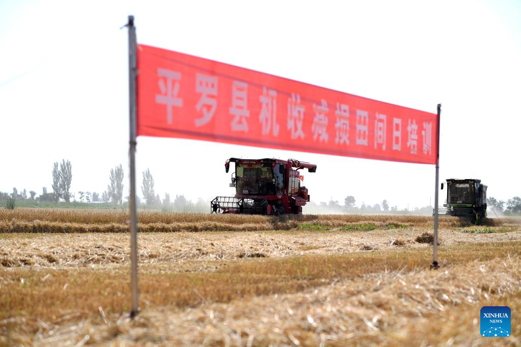 Combine harvesters are seen at wheat fields in Xiaodianzi Village of Pingluo County, northwest China's Ningxia Hui Autonomous Region, July 7. 2022. As wheat harvest season comes, local agricultural sector in Pingluo County conducted series of trainings for villagers to ensure harvest with high quality and efficiency. (Xinhua/Wang Peng)