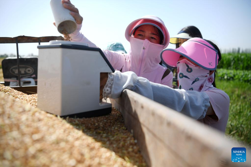 Staff of local agricultural sector measure moisture content of wheat at Xiaodianzi Village in Pingluo County, northwest China's Ningxia Hui Autonomous Region, July 7, 2022.