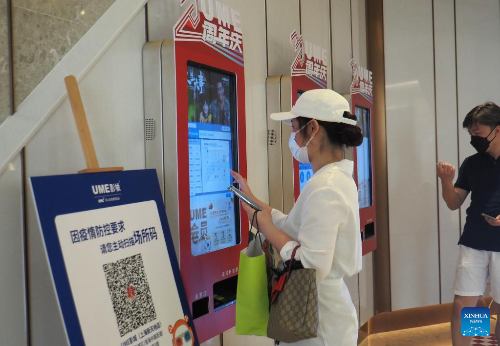 An audience gets movie tickets with at a UME cinema in east China's Shanghai, July 8, 2022. Some cinemas in Shanghai resumed operation with epidemic prevention measures in place on Friday. (Xinhua/Ren Long)