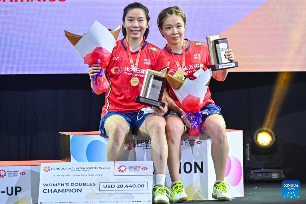 China's Chen Qingchen (R)/Jia Yifan pose for photos during the award ceremony for women's doubles event at Malaysia Masters 2022 in Kuala Lumpur, Malaysia, July 10, 2022. (Photo by Chong Voon Chung/Xinhua)
