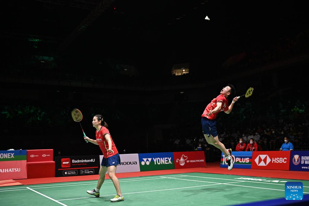 China's Zheng Siwei (R)/Huang Yaqiong compete during the mixed doubles final against Indonesia's Rinov Rivaldy/Pitha Haningtyas Mentari at Malaysia Masters 2022 in Kuala Lumpur, Malaysia, July 10, 2022. (Photo by Chong Voon Chung/Xinhua)