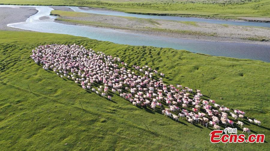 Livestock grazes in Bayanbulak grasslands in northwest China's Xinjiang Uyghur autonomous region in July, 2022. (Photo/China News Service)