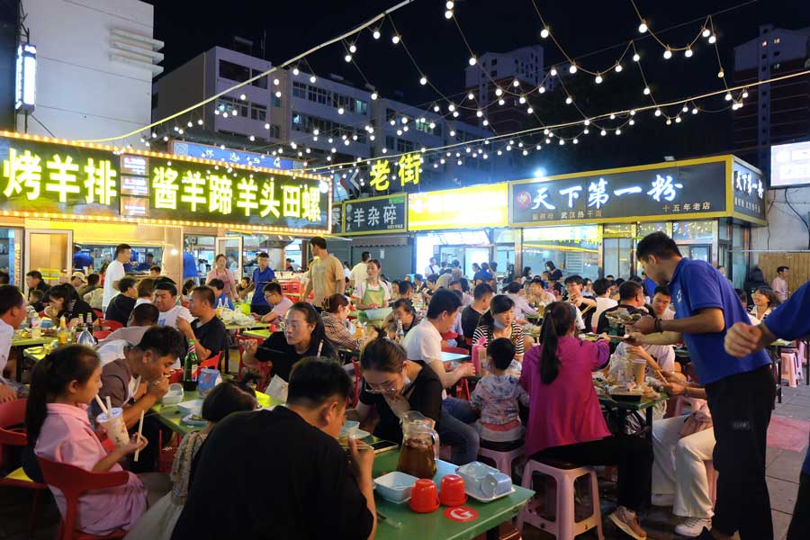 People eat local snacks at a night market in Yinchuan, northwest China's Ningxia Hui Autonomous Region on July 8, 2022. (People's Daily Online/Zhong Wenxing)