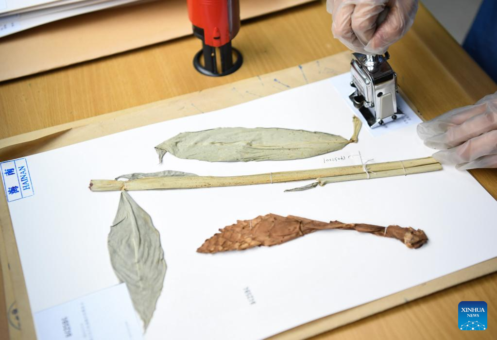 A staff member stamps plants samples with a serial number at South China National Botanical Garden in Guangzhou, capital of south China's Guangdong Province on July 4, 2022. China's second national botanical garden South China National Botanical Garden was officially inaugurated here Monday, after the country's first was unveiled in its capital city Beijing in April of this year. (Xinhua/Deng Hua)