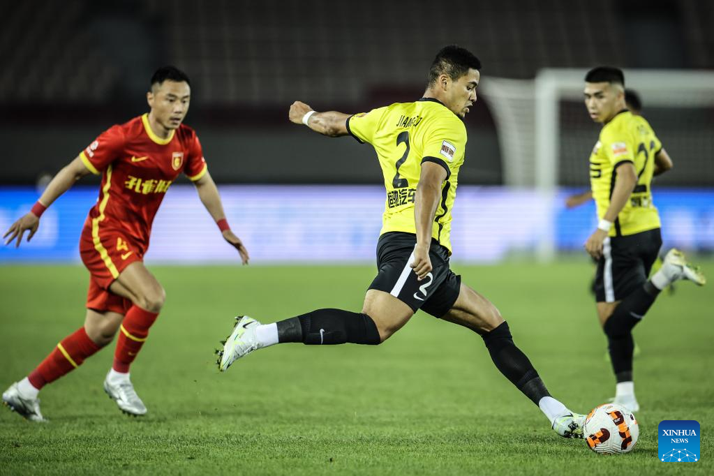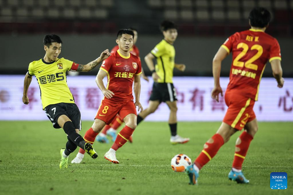 Jiang Guangtai (C) of Guangzhou passes the ball during a 2022 season Chinese Football Association Super League (CSL) match between Hebei FC and Guangzhou in Dalian, northeast China's Liaoning Province, July 11, 2022. (Xinhua/Pan Yulong)