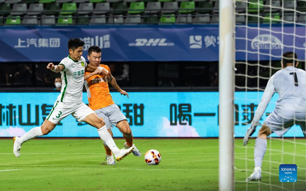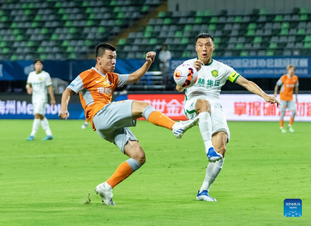 Yuan Mincheng (L) of Shenzhen FC vies with Wang Ziming of Beijing Guoan during their 2022 season Chinese Football Association Super League (CSL) match in Meizhou, south China's Guangdong Province, July 11, 2022. (Xinhua/Wang Guansen)
