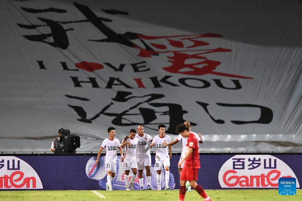 Players of Henan SSLM celebrate a goal during a 2022 season Chinese Football Association Super League (CSL) match between Changchun Yatai and Henan SSLM in Haikou, south China's Hainan Province, July 11, 2022. (Xinhua/Hu Zhixuan)