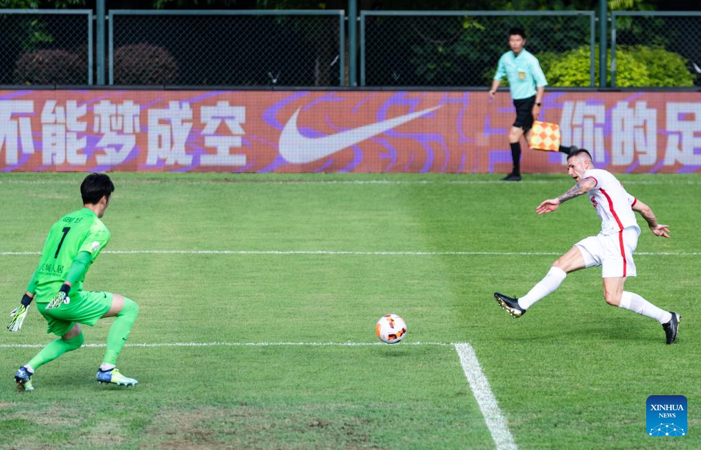 Aleksa Vukanovic (R) of Meizhou Hakka shoots during a 2022 season Chinese Football Association Super League (CSL) match between Chengdu Rongcheng and Meizhou Hakka in Meizhou, south China's Guangdong Province, July 11, 2022. (Xinhua/Wang Guansen)