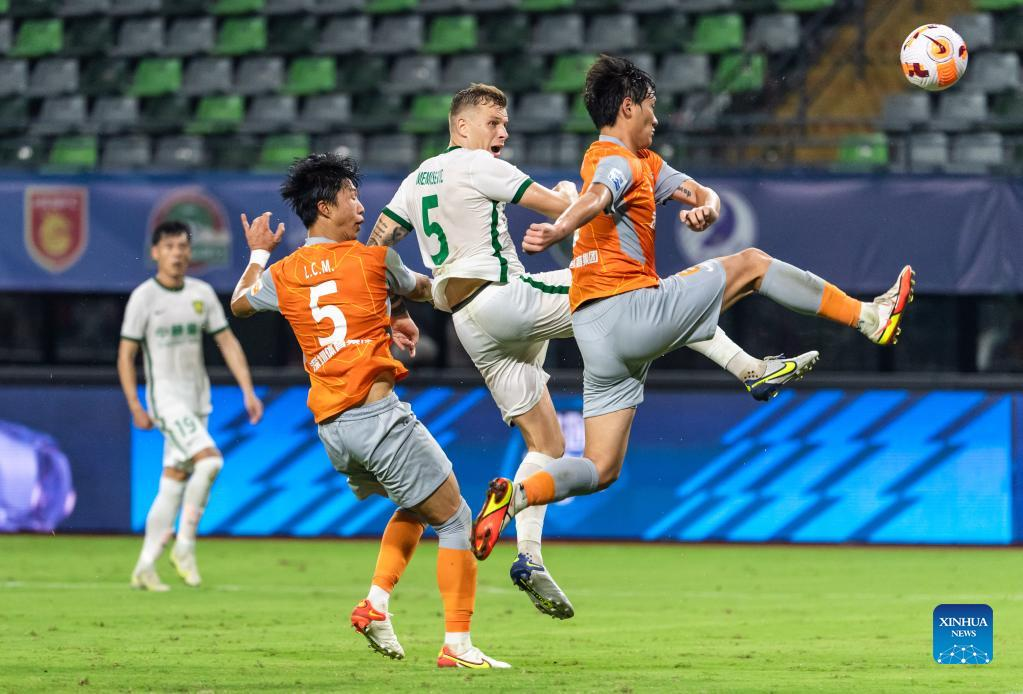 Samir Memisevic (2nd R) of Beijing Guoan shoots during a 2022 season Chinese Football Association Super League (CSL) match between Shenzhen FC and Beijing Guoan in Meizhou, south China's Guangdong Province, July 11, 2022. (Xinhua/Wang Guansen)