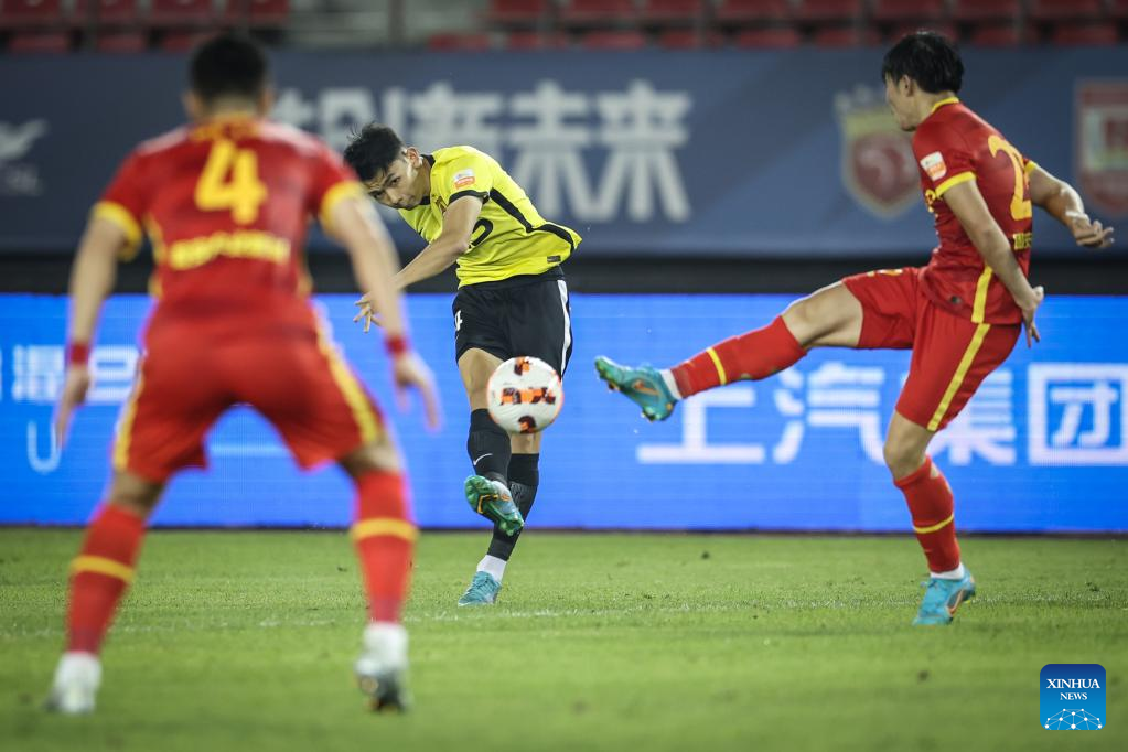Zhang Zili (C) of Guangzhou shoots during a 2022 season Chinese Football Association Super League (CSL) match between Hebei FC and Guangzhou in Dalian, northeast China's Liaoning Province, July 11, 2022. (Xinhua/Pan Yulong)