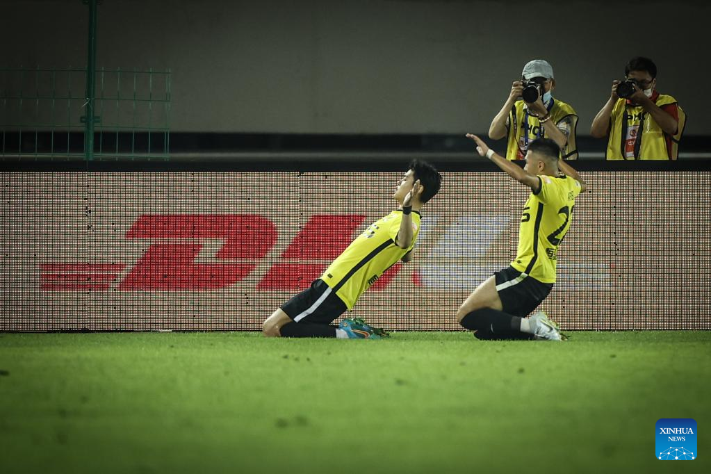 Yang Liyu (L) of Guangzhou celebrates his goal during a 2022 season Chinese Football Association Super League (CSL) match between Hebei FC and Guangzhou in Dalian, northeast China's Liaoning Province, July 11, 2022. (Xinhua/Pan Yulong)