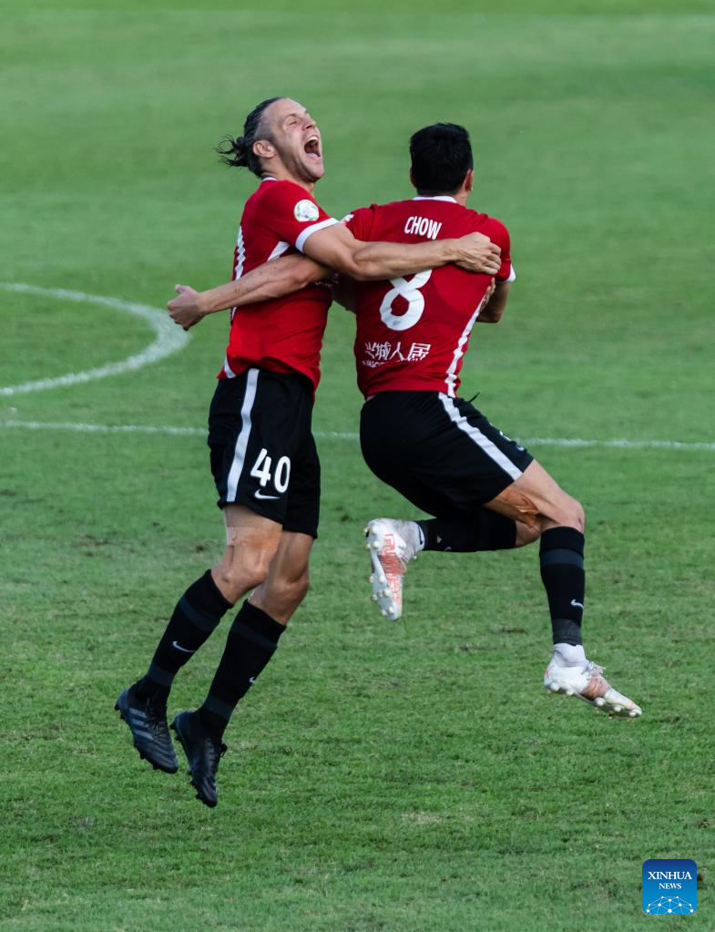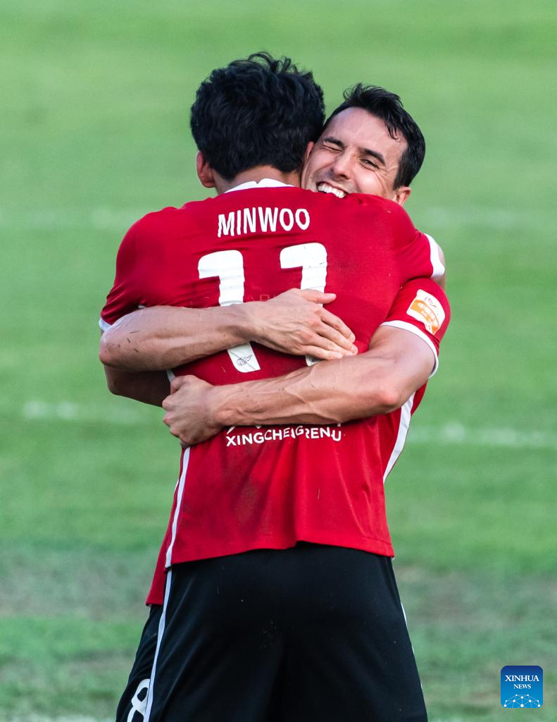 Tim Chow (R) of Chengdu Rongcheng celebrates with his teammate Kim Min-woo after a 2022 season Chinese Football Association Super League (CSL) match between Chengdu Rongcheng and Meizhou Hakka in Meizhou, south China's Guangdong Province, July 11, 2022. (Xinhua/Wang Guansen)