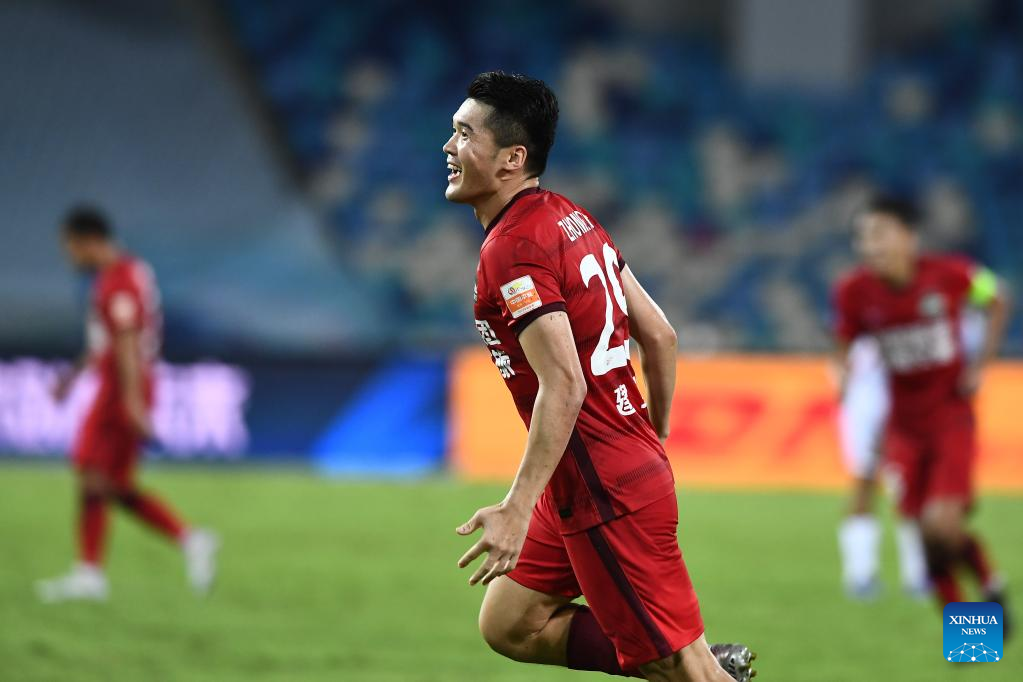 Zhong Yihao of Henan SSLM celebrates his goal during a 2022 season Chinese Football Association Super League (CSL) match between Changchun Yatai and Henan SSLM in Haikou, south China's Hainan Province, July 11, 2022. (Xinhua/Hu Zhixuan)
