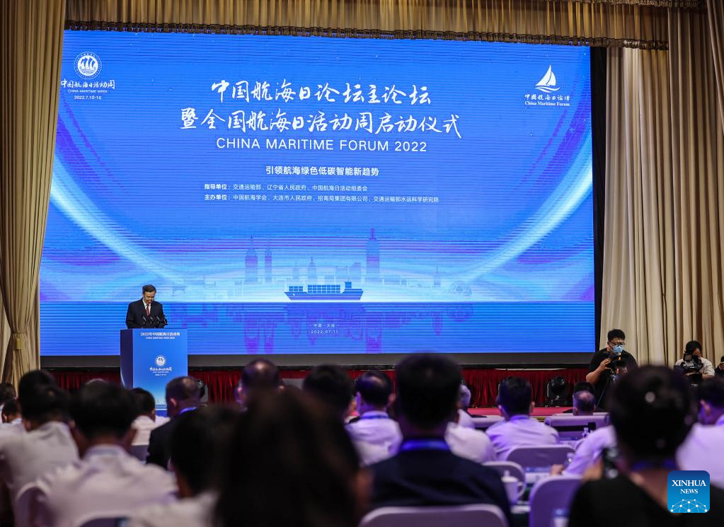 Photo taken on July 11, 2022 shows the launching ceremony of China Maritime Week in Dalian, northeast China's Liaoning Province. July 11 marks the Maritime Day of China. (Xinhua/Pan Yulong)