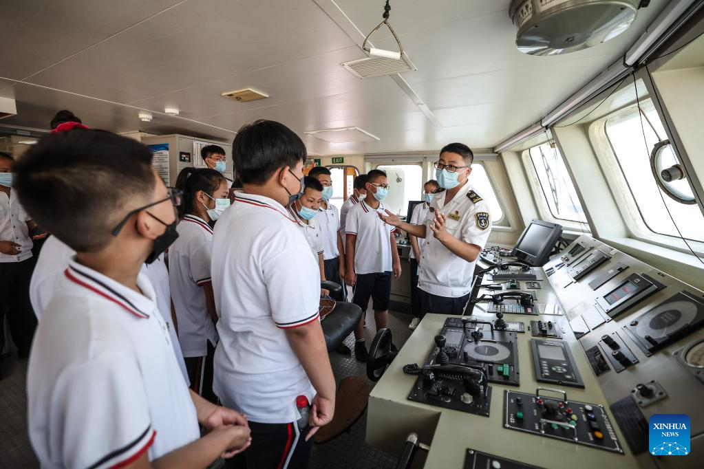 Pupils visit the patrol ship "Haixun 0301" during a Maritime Day theme activity in Dalian, northeast China's Liaoning Province, July 11, 2022. July 11 marks the Maritime Day of China. (Xinhua/Pan Yulong)
