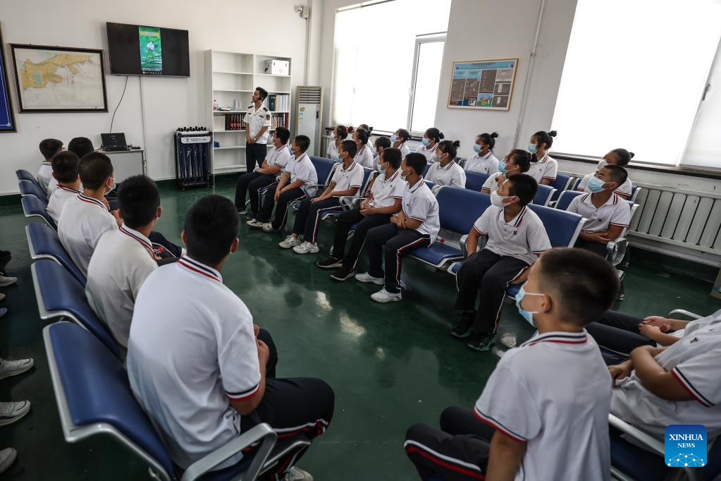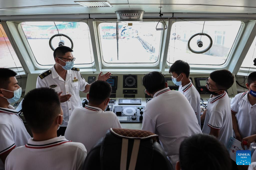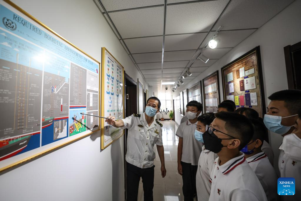 Pupils learn about maritime knowledge at the exam center of the maritime safety administration of Liaoning during a Maritime Day theme activity in Dalian, northeast China's Liaoning Province, July 11, 2022. July 11 marks the Maritime Day of China. (Xinhua/Pan Yulong)