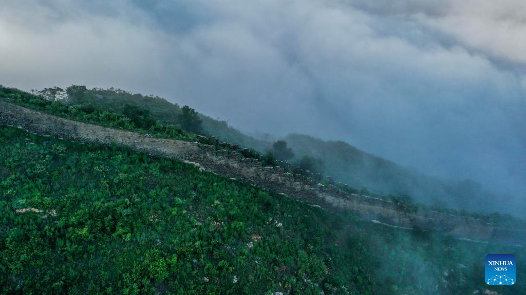Aerial photo taken on July 11, 2022 shows clouds floating over a section of the Great Wall in Qianxi County, north China's Hebei Province. (Photo by Wang Aijun/Xinhua)