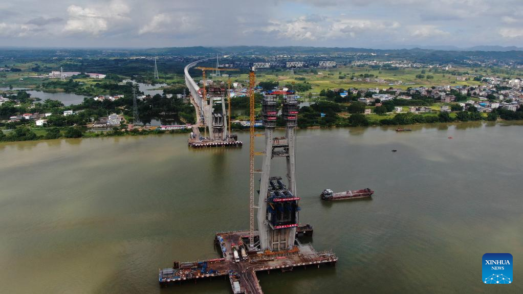 Aerial photo taken on July 10, 2022 shows the construction site of a bridge of the high-speed railway linking Nanning and Yulin of south China's Guangxi Zhuang Autonomous Region. With a designed speed of 350 km per hour, the Nanning-Yulin high-speed railway is a crucial part of the high-speed railway linking Nanning of Guangxi Zhuang Autonomous Region and Shenzhen of Guangdong Province. (Xinhua/Zhang Ailin)