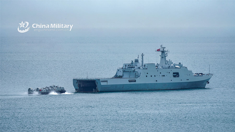 An air cushion landing craft disembarks from a Type 071 amphibious landing ship during a collaboration exercise jointly conducted by an army brigade and a navy unit under the PLA Eastern Theater Command on June 16, 2022. (eng.chinamil.com.cn/Photo by Lin Jiayu)