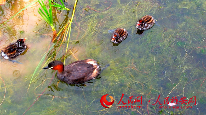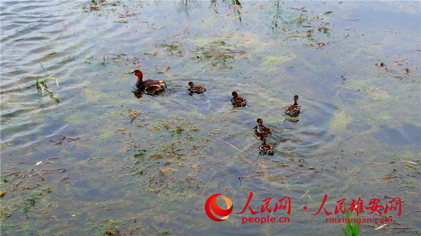 A little grebe and several fledglings take a rest on the waters of Baiyangdian Lake in the Xiong’an New Area, north China’s Hebei Province. (Photo/Gao Teng)