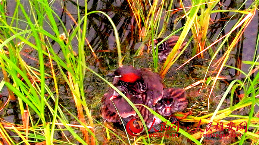 A little grebe that has recently finished building its nest on a reed bed was spotted foraging with her offspring on Baiyangdian Lake in the Xiong’an New Area, north China’s Hebei Province. The fledglings would climb onto their mother’s back whenever they got tired from swimming, later leading them back to their home where the chicks would sleep under her wings.