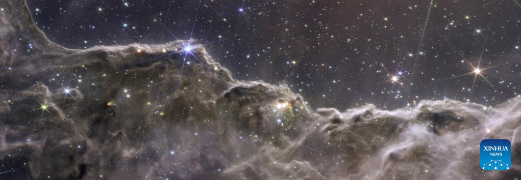 Image released by NASA on July 12, 2022 shows a composite image of the Cosmic Cliffs in the Carina Nebula, created with James Webb Space Telescope's NIRCam and MIRI. NASA released James Webb Space Telescope's first full-color images of the universe and their spectroscopic data on Tuesday, revealing the unprecedented and detailed views of the universe. (NASA, ESA, CSA, STScI/Handout via Xinhua)