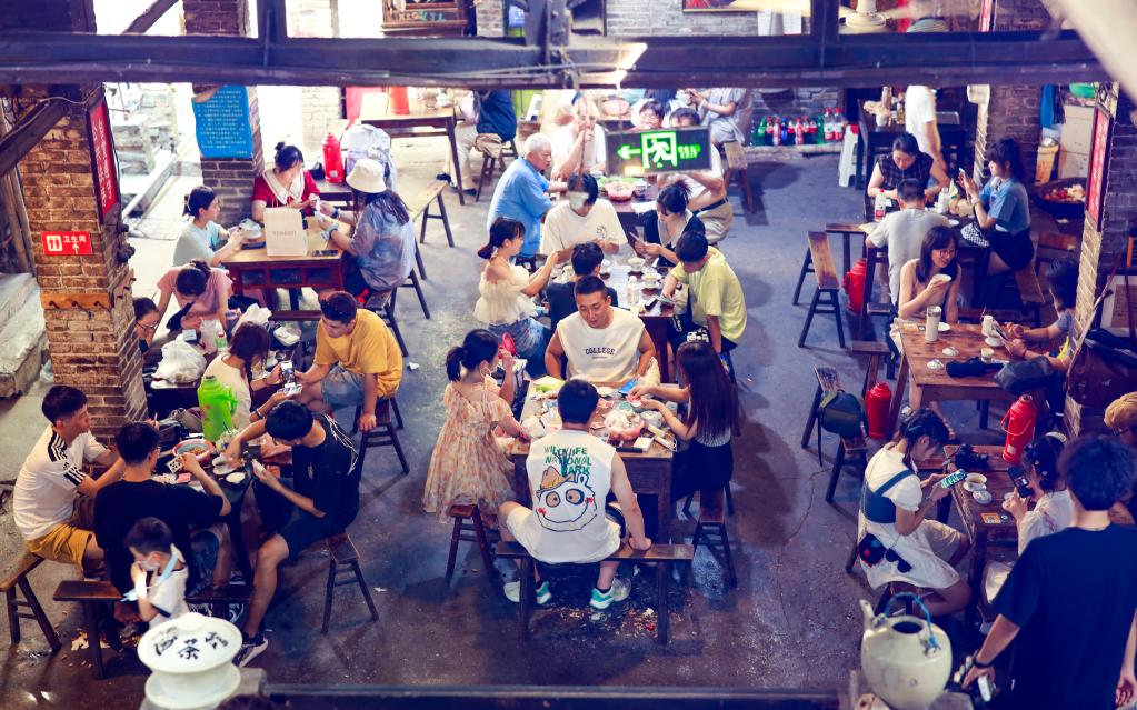 Cafe owner Chen Huanwen (R, back) chats with customers in Jiulongpo District of southwest China's Chongqing, July 11, 2022. As Chongqing is sweltering in a heatwave, locals turn to different places to escape the scorching heat. (Xinhua/Liu Chan)