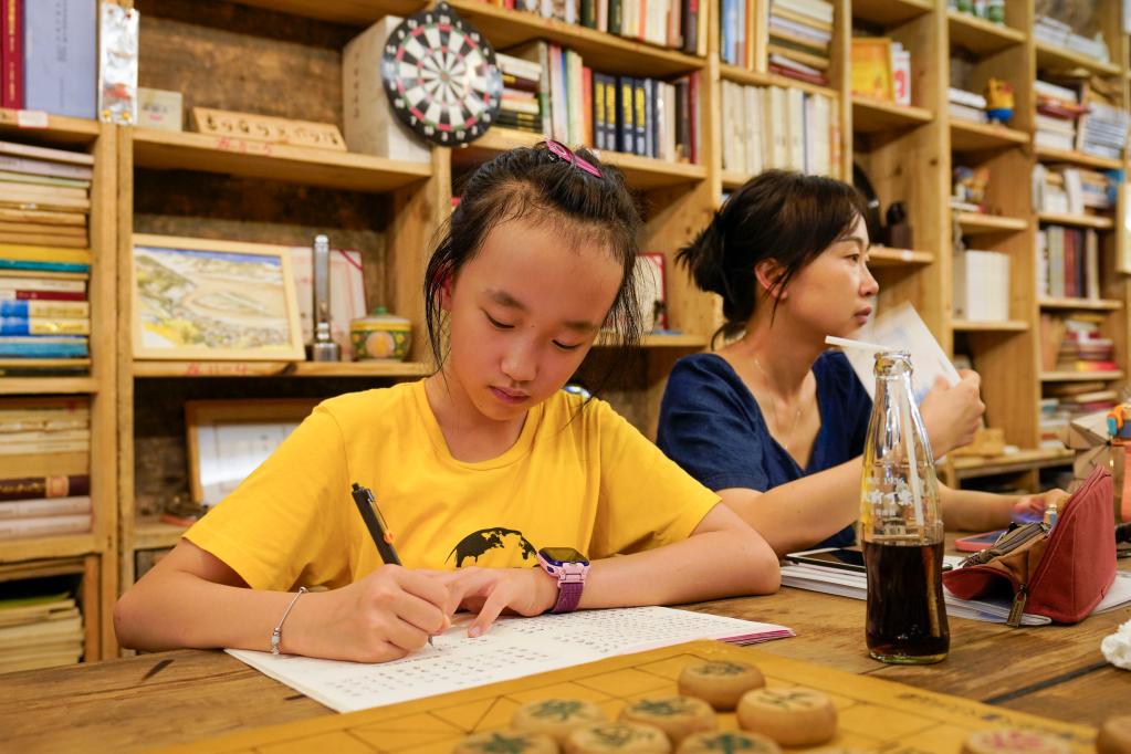 A girl studies in a bookstore renovated from a former air-raid shelter in Jiulongpo District of southwest China's Chongqing, July 11, 2022. As Chongqing is sweltering in a heatwave, locals turn to different places to escape the scorching heat. (Xinhua/Liu Chan)