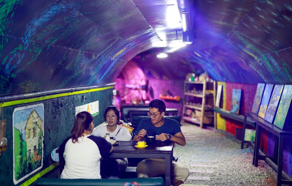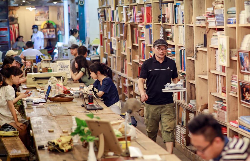 A bookstore owner serves readers tea in a bookstore renovated from a former air-raid shelter in Jiulongpo District of southwest China's Chongqing, July 11, 2022. As Chongqing is sweltering in a heatwave, locals turn to different places to escape the scorching heat. (Xinhua/Liu Chan)