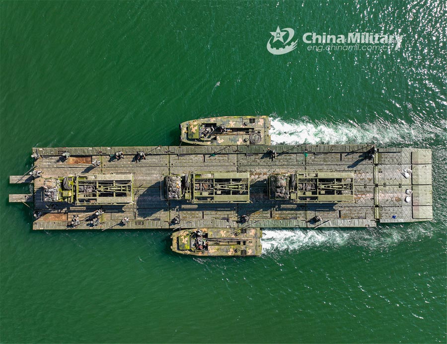 Propulsion boats attached to an engineer brigade under the PLA 72nd Group Army maneuver a ferrying pontoon bridge with onboard vehicles for river crossing during a training exercise on July 1, 2022. (eng.chinamil.com.cn/Photo by Qin Xingfeng)