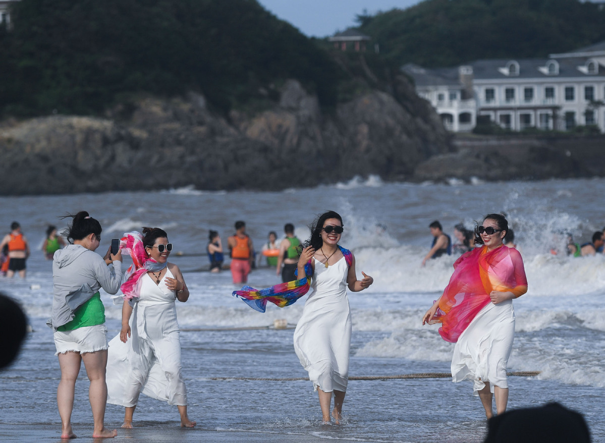 Women take photos at the Zhujiajian Scenic Area in Zhoushan of East China's Zhejiang province on June 28. [Photo/Xinhua]