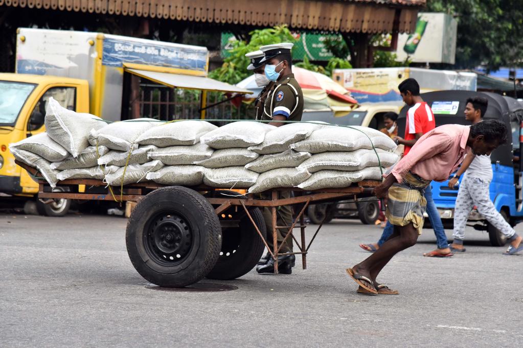 A porter transports sacks of dry food along a street in Colombo, Sri Lanka, on July 7, 2022. (Photo by Gayan Sameera/Xinhua)
