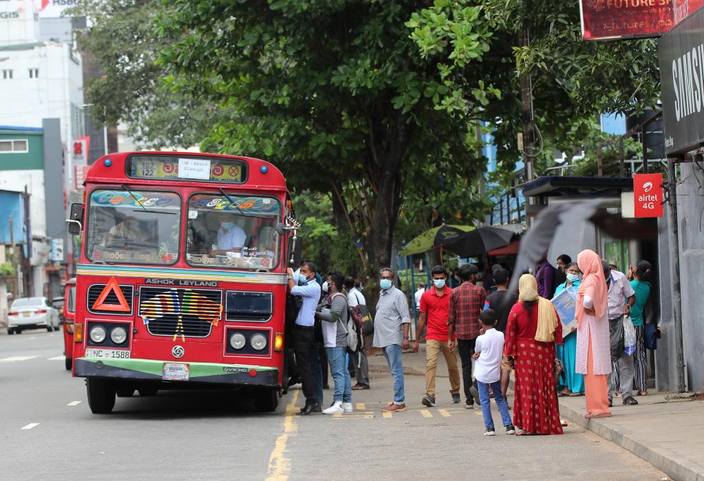 People wait for city bus at a bus stop in Colombo, Sri Lanka, on July 11, 2022. Due to severe shortage of fuel, local residents are more likely to travel by bus and bicycle in Colombo. (Photo by Ajith Perera/Xinhua)