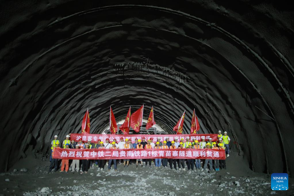 Aerial photo taken on July 13, 2022 shows the Qingmiaozhai tunnel of the Guiyang-Nanning high-speed railway in southwest China's Guizhou Province. The Qingmiaozhai tunnel was through on Wednesday, which was the lastly drilled through one among all 63 tunnels on the Guiyang-Nanning high-speed railway designed with a maximum speed of 350 km per hour. (Xinhua/Liu Xu)