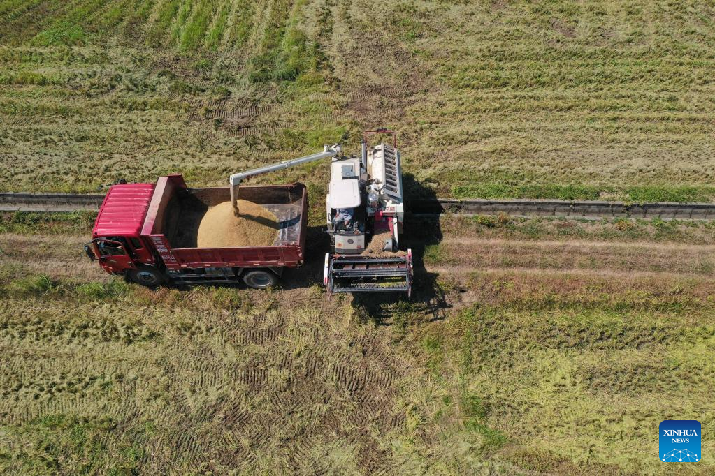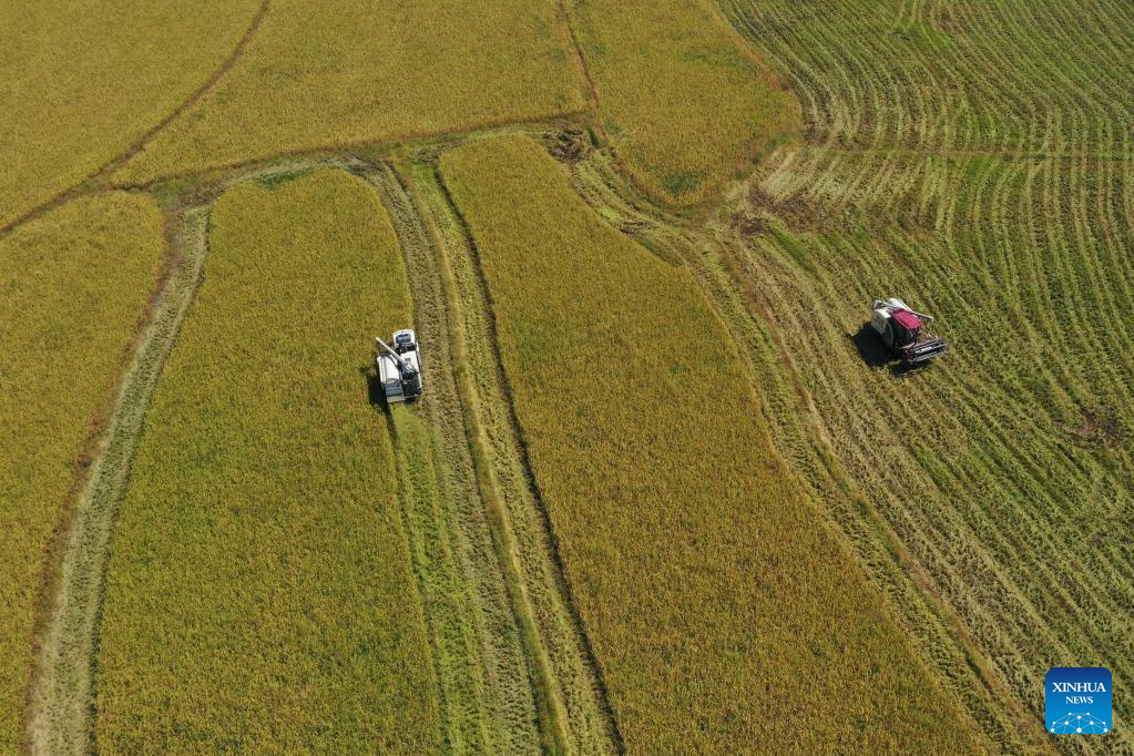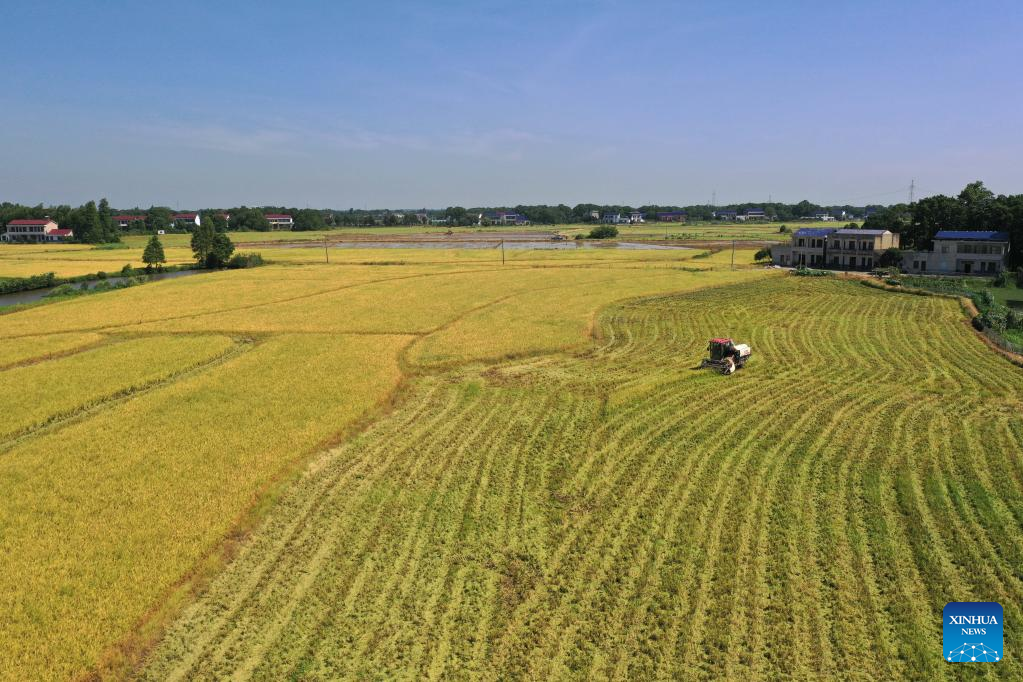 Aerial photo shows a harvester working in a paddy field in Xinsongshuqiao Village in the city of Yiyang, central China's Hunan Province, July 13, 2022. (Xinhua/Xue Yuge)