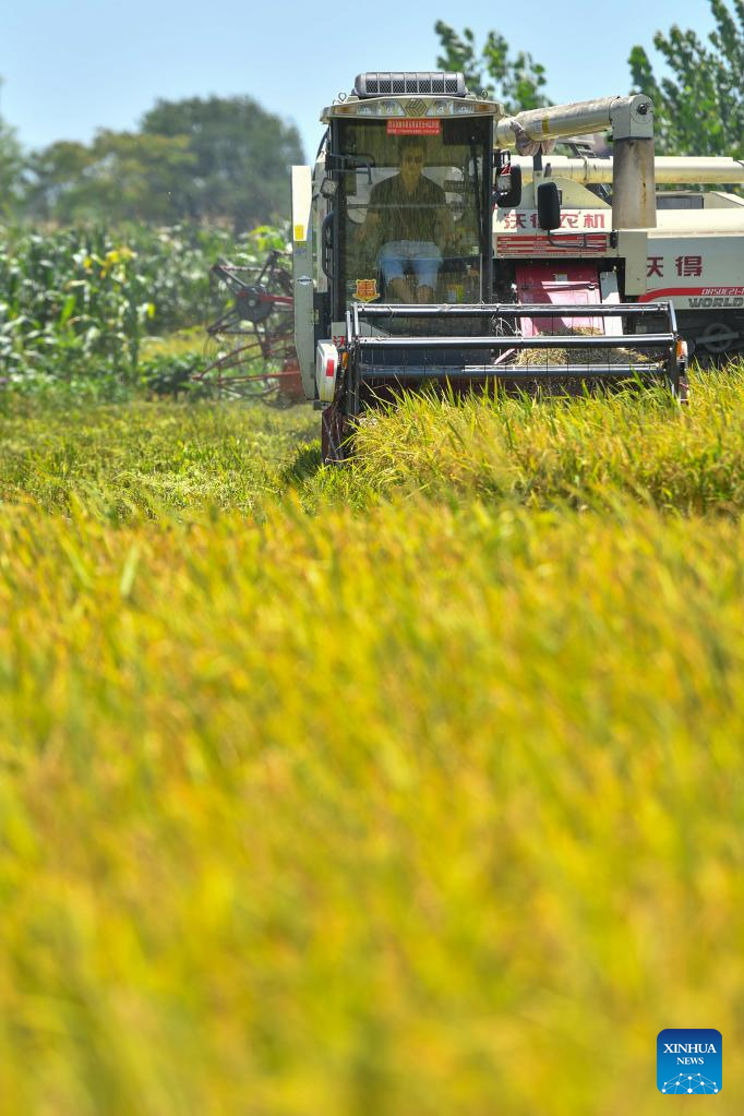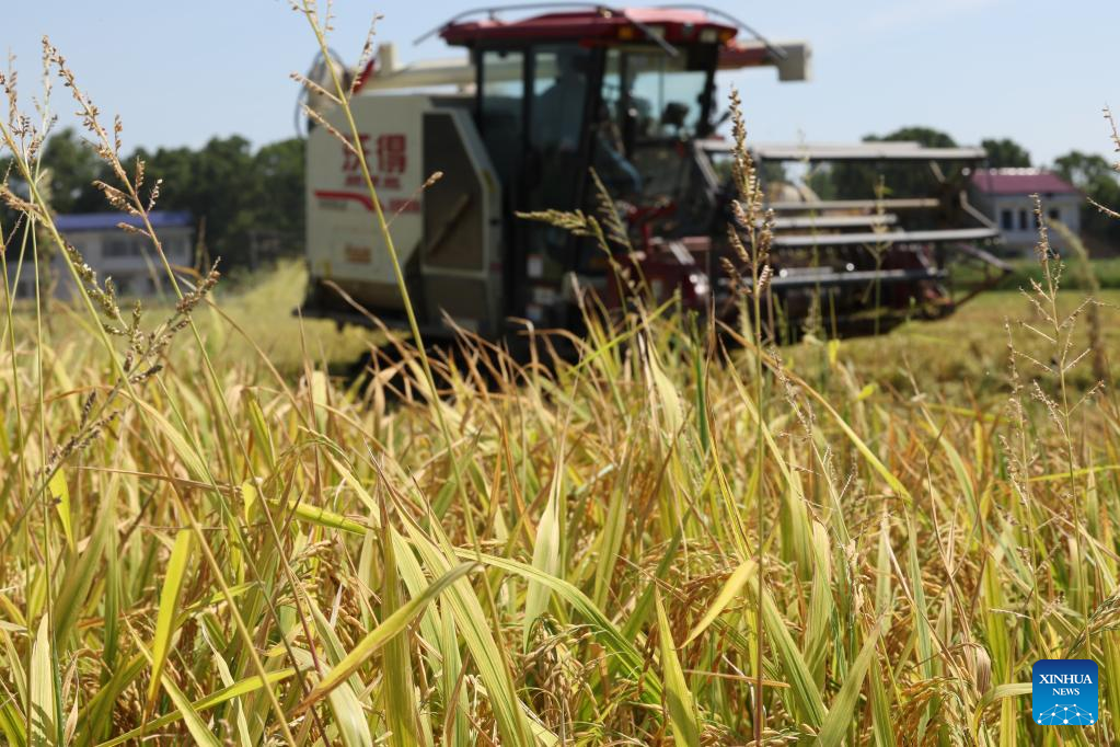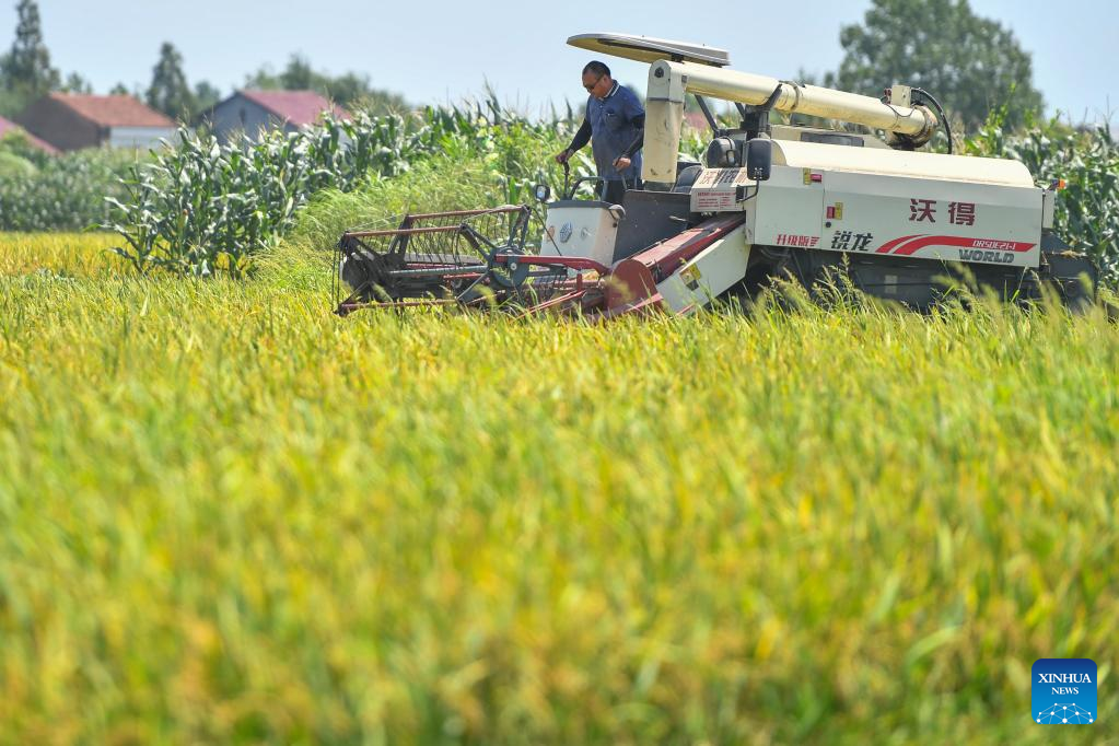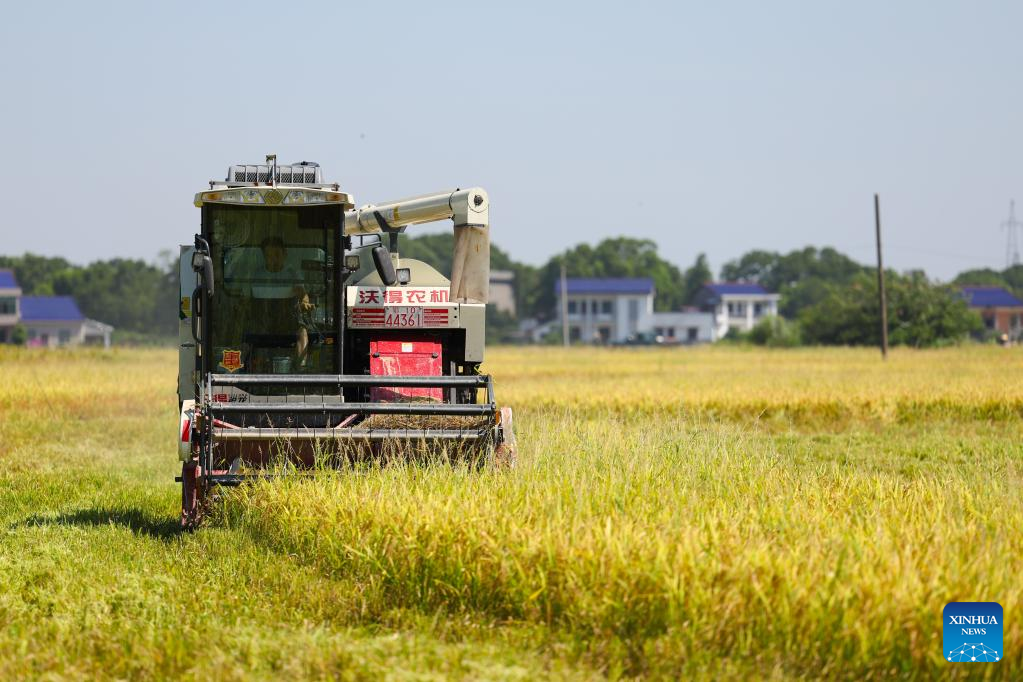 A farmer driving a harvester works in a paddy field in Xinsongshuqiao Village in the city of Yiyang, central China's Hunan Province, July 13, 2022. (Xinhua/Xue Yuge)