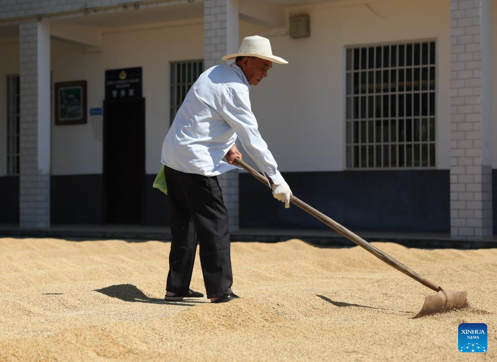 A farmer airs rice in Xinsongshuqiao Village in the city of Yiyang, central China's Hunan Province, July 13, 2022. (Xinhua/Xue Yuge)