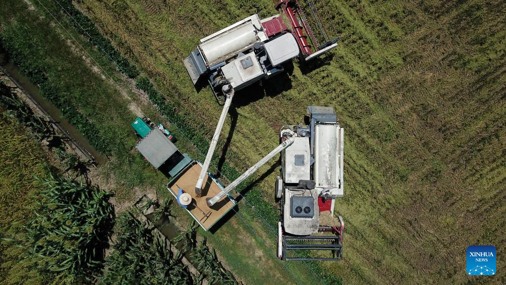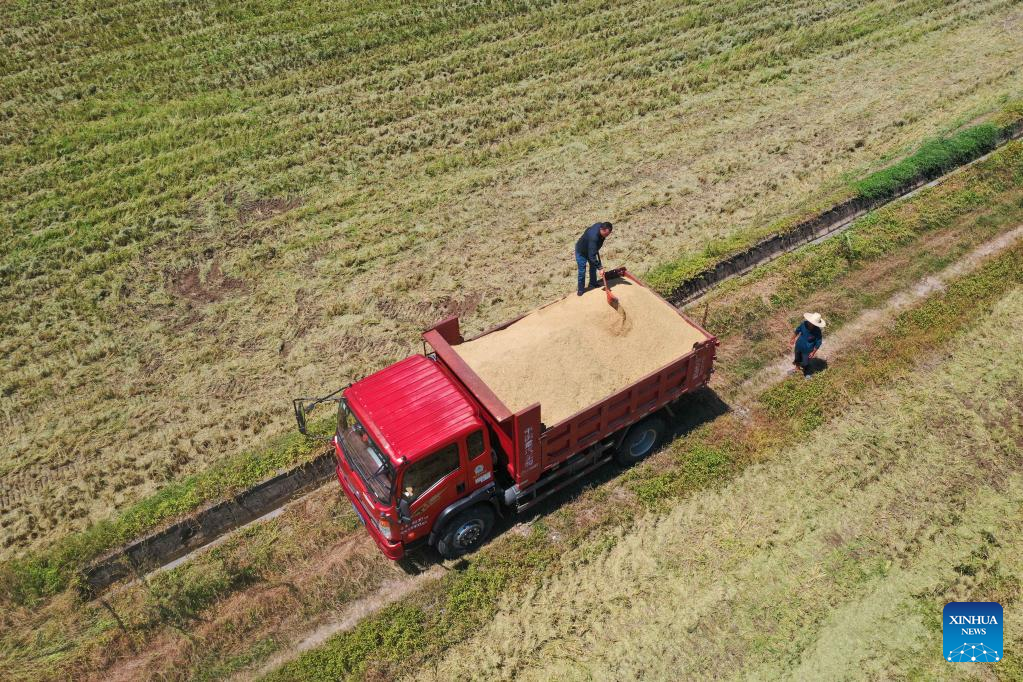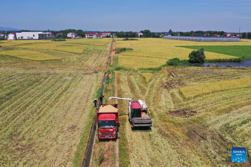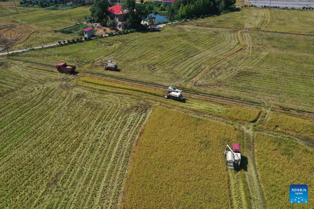 Aerial photo shows harvesters working in a paddy field in Xinsongshuqiao Village in the city of Yiyang, central China's Hunan Province, July 13, 2022. (Xinhua/Xue Yuge)