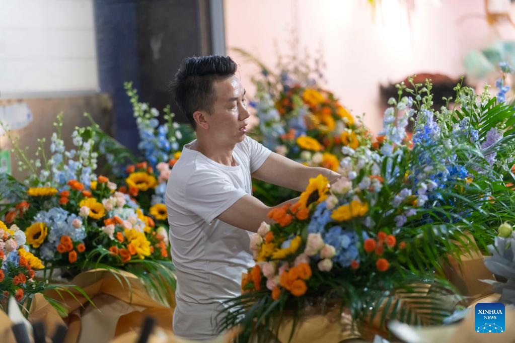 A shopkeeper makes flower basket at the Kunming Dounan Flower Market at night in southwest China's Yunnan Province, July 12, 2022. Standing as China's largest fresh cut flower market in terms of both trade volume and export value for 23 consecutive years, Dounan has become the largest fresh cut flower trading market in Asia. In recent years, the market has vigorously developed the night economy with flower consumption, tourism and cultural experience. (Xinhua/Chen Xinbo)