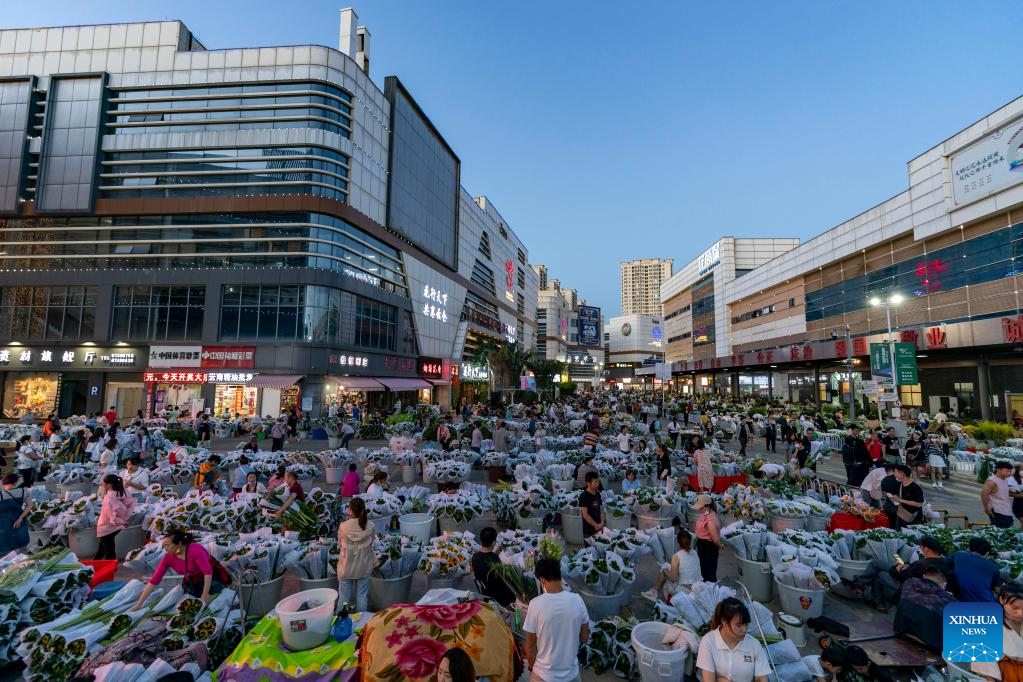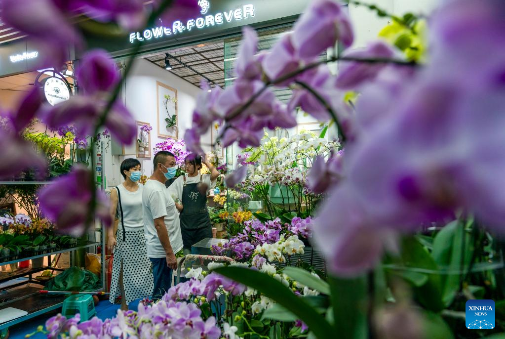 People visit the Kunming Dounan Flower Market at night in southwest China's Yunnan Province, July 12, 2022. Standing as China's largest fresh cut flower market in terms of both trade volume and export value for 23 consecutive years, Dounan has become the largest fresh cut flower trading market in Asia. In recent years, the market has vigorously developed the night economy with flower consumption, tourism and cultural experience. (Xinhua/Chen Xinbo)