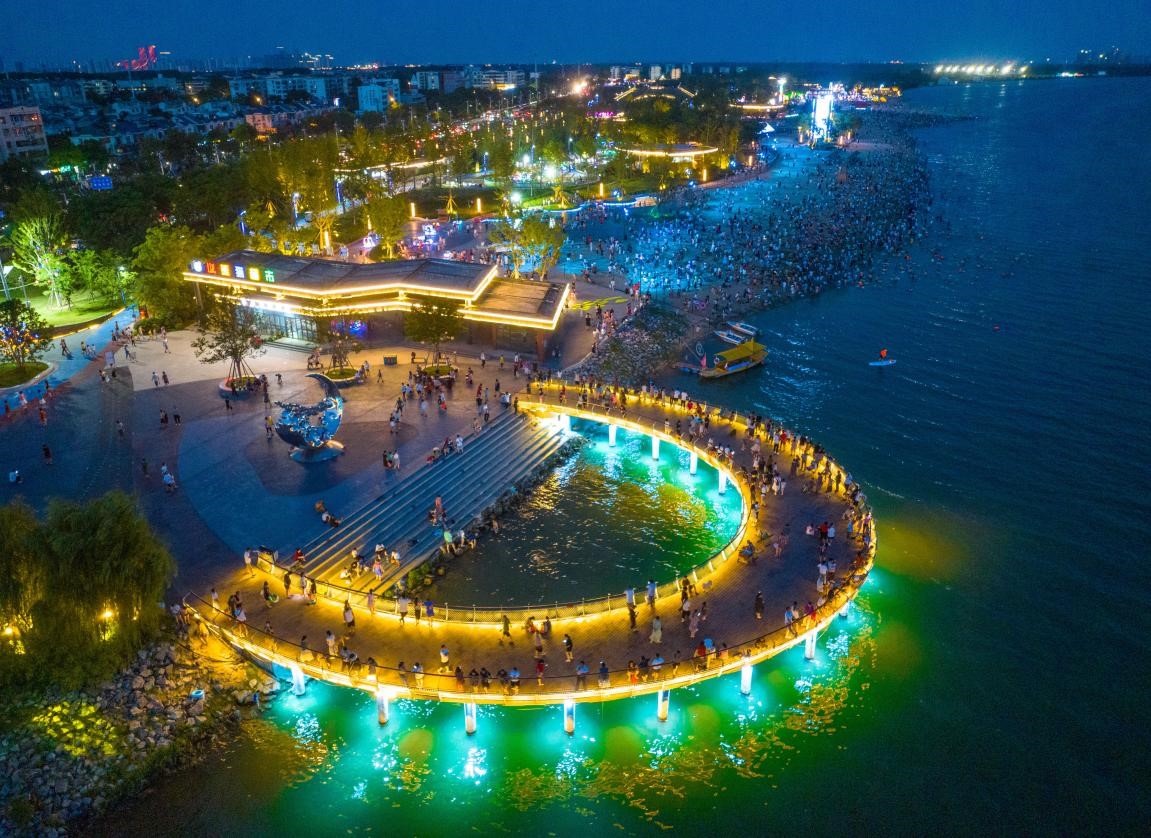 Photo taken on July 10 shows a neon-illuminated beach by the Hanjiang River, Xiangyang, central China's Hubei province. The city of Xiangyang has rolled out a series of measures based on the features of local resources to optimize the night economy. (People's Daily Online/Yang Dong)