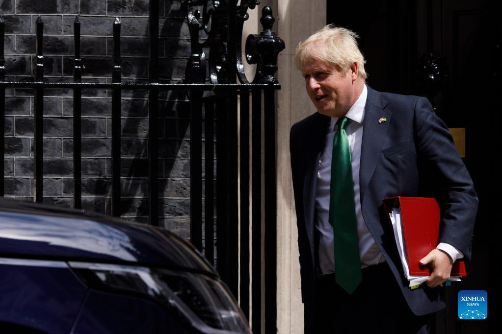 British Prime Minister Boris Johnson leaves 10 Downing Street for Prime Minister's Questions in London, Britain, July 13, 2022. Boris Johnson resigned as British prime minister and the leader of the Conservative Party in a statement to the country on July 7. The new prime minister of the United Kingdom (UK) replacing incumbent Boris Johnson will be announced on September 5, said Graham Brady, chairman of the Conservative Party's backbench 1922 Committee, on Monday. (Photo by Tim Ireland/Xinhua)