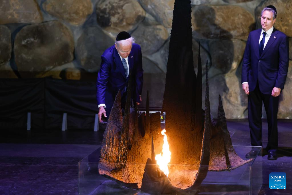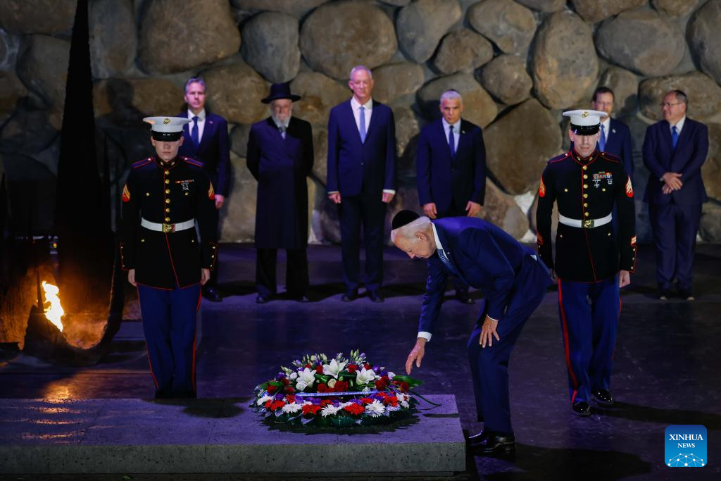 U.S. President Joe Biden (Front) attends a wreath-laying ceremony at Yad Vashem, Israel's Holocaust memorial in Jerusalem, on July 13, 2022. Biden landed in Israel on Wednesday afternoon, starting his first visit to the Middle East as president, during which he will hold talks with officials of Israel, Palestine, and Saudi Arabia. (Olivier Fitoussi/JINI via Xinhua)