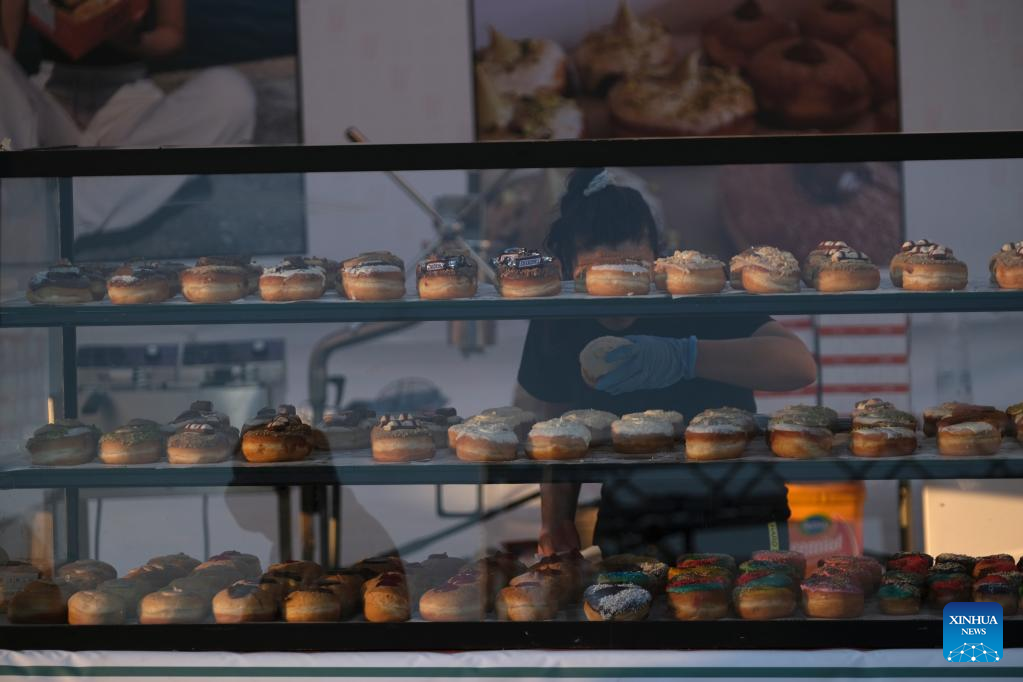 An employee organizes donuts at the Malta International Food Festival in Valletta, Malta, on July 13, 2022. (Photo by Jonathan Borg/Xinhua)